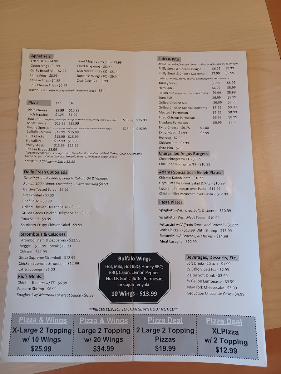 Welcome to Adam's Pizza & Grill, your new favorite spot in Jamestown, NC! Here, the menu is a delightful mix of flavors, featuring something for everyone. Start with their Deep Fried Chicken Wings, available as either boneless or traditional, served with a side of creamy ranch or blue cheese. For burger aficionados, the Black Angus Jumbo Chili Cheeseburger and the classic Black Angus Jumbo Cheeseburger are must-tries, both grilled to perfection and paired with crispy fries.